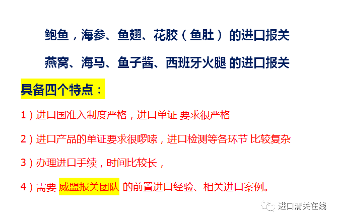 鲍鱼,海参、鱼翅、花胶(鱼肚)的进口报关;燕窝、海马、鱼子酱、西班牙火腿的进口报关,这类进口报关技术,很值得进口贸易商重视,