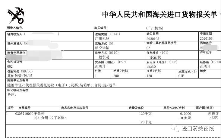 鱼翅 正规进口报关的案例