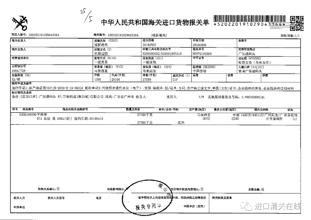 海参(全球多国)的正规进口报关案例